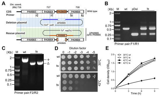 Δpa0665/pTS-pa0665 exhibits growth defect on LB at the restrictive temperature. (A) The pa0665 deletion allele cassette (blue line) in the deletion plasmid and complementary sequences (brown line) in the rescue plasmid are shown in a physical map. Δpa0665/pTS-pa0665 (ts) carries a deletion allele, Δpa0665, on the chromosome, along with a complementary copy of pa0665 controlled by a native promoter on a temperature-sensitive plasmid. (B,C) PCR assays for pa0665 alleles use F1-R1 and F2-R2 primer pairs located inside and outside the pa0665 complementary sequences on the rescue cassette, revealing the chromosomal deletion allele in Δpa0665/pTS-pa0665 isolates. (D) Spot-plating assay displays Δpa0665/pTS-pa0665 growth, where 10-fold serial dilutions of wild-type and mutant cells were spotted on an LB plate and incubated overnight at 30 °C and 42 °C. (E) Growth curves of the second subcultures are shown, with time (h) on the x-axis and cell density (OD600) on the y-axis.
