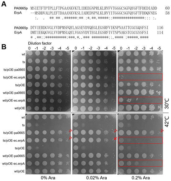 Using BLASTp alignment (www.ncbi.nlm.nih.gov/blast accessed on 15 March 2024), we discovered that the protein sequences of Pa0665 from P. aeruginosa and ErpA from E. coli share 65.5% identity across 116 overlapping residues (Figure 2A). This level of identity, exceeding 40%, is sufficient to suggest a structural similarity between the two proteins [19]. To determine whether ec.erpA is a true ortholog of pa0665 in P. aeruginosa, a complementation experiment was performed. We engineered overexpression constructs for pa0665-OE and ec.erpA-OE, with transcription regulated by the arabinose-inducible PBAD promoter [20] in the multi-host pBBR1MCS-5 plasmid [12], resulting in pOE-pa0665 and pOE-ec.erpA constructs. Spot-plating assay indicated that under no inducer arabinose, multi-host plasmid pOE-ec.erpA at leakage expression level was sufficient to rescue the growth defect of Δpa0665/pTS-pa0665 at 42 °C, similar to the positive control plasmid pOE-pa0665 (Figure 2B, see arrowheads). Mild induction of ec.erpA with 0.02% arabinose rescued the growth defect of the Δpa0665/pTS-pa0665 pOE-ec.erpA strain at 42 °C (Figure 2B, see arrow), while strong induction of ec.erpA with 0.2% arabinose impeded the growth of Δpa0665/pTS-pa0665 pOE-erpA strain and the wild type (Figure 2B, see rectangles). These findings confirm that leaky expression and mild induction of ec.erpA can functionally compensate for the growth defect caused by pa0665 deficiency in P. aeruginosa.