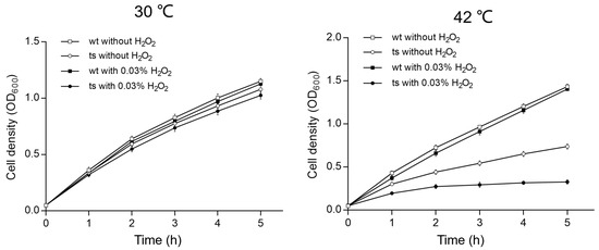 The spot-plating assay [13] was employed to assess sensitivities to stress factors, including antibiotics, sucrose, hydrogen peroxide, and temperature. In brief, 10-fold serially diluted cultures were transferred onto LB plates supplemented with the relevant stress factors using a 48-pin replicator (V&P Scientific, Inc., San Diego, CA, USA) and incubated at 30 °C or 42 °C as required.