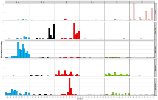 - Wellcome Sanger Institute. Catalogue of Somatic Mutations in Cancer (COSMIC) Mutational Signatures (v3.3-June 2022). 2022. Available online: https://cancer.sanger.ac.uk/signatures/sbs/ (accessed on 1 June 2023).