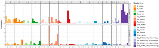 Extracted insertion–deletion signatures from 100 early-onset breast cancer patients in Alberta, Canada using non-negative matrix factorization. The x-axis represents the homopolymer length for single-base pair deletions and insertions, the number of repeat units for >1 base pair deletions and insertions at repeats, and microhomology length for microhomology deletions. The y-axis is the number of insertions–deletions.