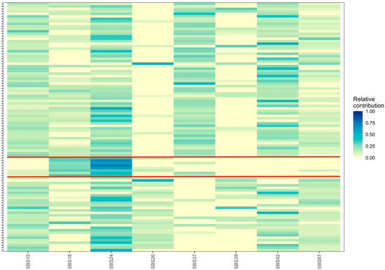 Relative contribution heatmap of unsupervised hierarchal clustering analysis of eight COSMIC single-base substitution signatures into three distinct clusters, which are separated by red lines. The x-axis represents the COSMIC single-base substitution signatures and the y-axis represents samples. SBS = single-base substitution.