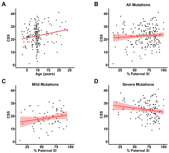 X chromosome inactivation does not correlate with raw clinical severity scores. (A) Raw clinical severity scores (CSS) at visit closest to 9.7 years old, the mean age of all visits for the XCI cohort. Linear regression (red line) shows an age-dependent increase in severity. (B) Raw CSS scores plotted against percentage of pXCI for all participants (n = 198, red line: linear regression of plotted values, shaded area: standard error) showing no correlation (Pearson’s r = 0.074; p = 0.298; 95% CI: −0.066 to 0.212). (C) No correlation between pXCI and raw CSS for individuals with mild MECP2 variants (R133C, R294X, R306C, or CTT; n = 66; Pearson’s r = 0.20; p = 0.103; 95% CI: −0.042 to 0.424). (D) A trend towards a weak negative correlation between pXCI and raw CSS is seen for individuals with severe MECP2 variants (early truncation, R106W, T158M, R168X, R255X, R270X, or large deletions; n = 132; Pearson’s r = −0.17; p = 0.055; 95% CI: −0.329 to 3.33 × 10−3).