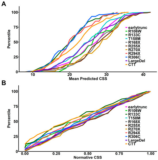 Generation of variant-specific normative CSS scores. (A) Cumulative distributions of within-subject mean predicted CSS for MECP2 variant groups showing expected genotype–phenotype relationship as presented in Figure 2. Normative CSS for each participant is generated by determining the variant group-specific percentile for the participant’s mean predicted CSS. (B) Cumulative distributions of normative CSS scores by MECP2 variant group demonstrates expected loss of genotype–phenotype relationship for variant-specific normative CSS scores.