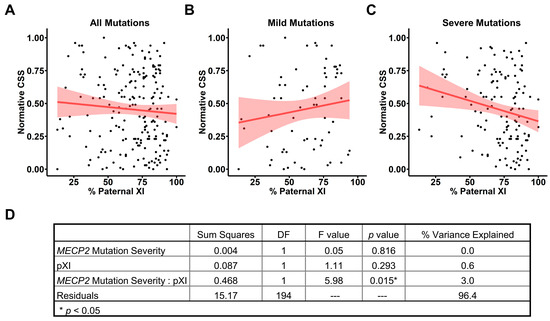 Pearson’s correlation coefficients were calculated separately for the association of paternal XCI with CSS for all individuals, those with mild MECP2 variants, and those with severe variants. Potential interactions between MECP2 variant severity and XCI were assessed by regression analysis of a simplified model of normative CSS: