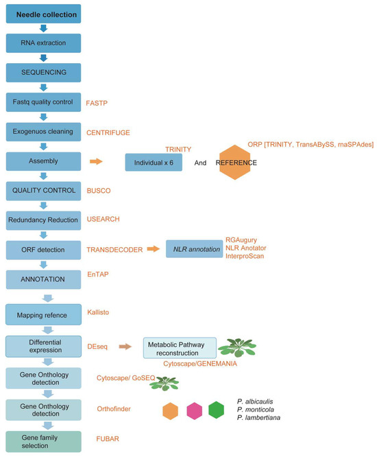 For the transcriptomic analysis, needle tissue was collected from six 2-year-old half-sib whitebark pine seedlings (three inoculated and three not inoculated) from parent tree 06017-004. This family had shown quantitative disease resistance in a previous trial [20]. In previous trials of other seedlings from this parent tree, the family showed <60% early stem infection compared with 100% in the most susceptible families. Needle tissue was collected four days after inoculation in September 2021, flash-frozen in liquid nitrogen, and stored at −80 °C until RNA extraction. Figure 1 shows a summary of the bioinformatic processing followed in this study.