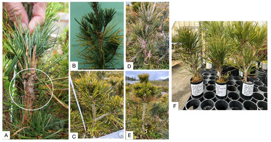 Phenotypical characterization of WPBR. (A). Canker formation in seedling 20 months after the inoculation (white circle). (B) Needle spot and leaf discoloration one year after the inoculation. (C). Inoculated seedling (Fam: 06017-004; ind: 1281) 18 months after inoculation. (D). Inoculated seedling (Fam: 06017-004; ind: 1282) 18 months after inoculation. (E). Inoculated seedling (Fam: 06017-004; ind: 1283) 18 months after inoculation. (F). Non-inoculated seedlings (Fam: 06017-004; ind: 1284, 1285, and 1286) after 18 months of the experiment.