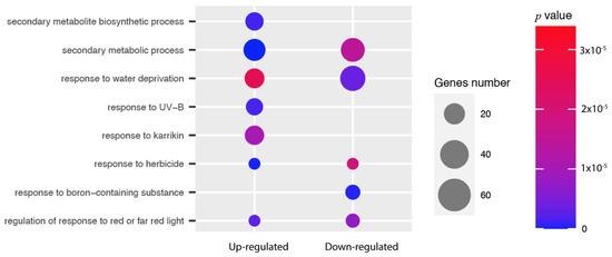 Biological process gene ontology (GO) enrichment analysis. This figure shows the eighth most enriched GO terms of upregulated (3 × 10−5) and downregulated (0) genes in P. albicaulis related to the abiotic stress response.
