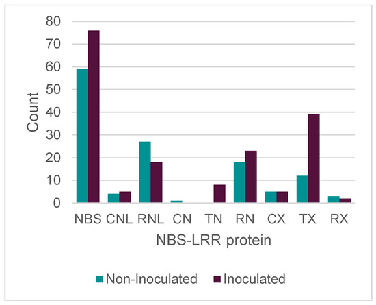 NBS-LRR protein comparison between non-inoculated and inoculated samples of P. albicaulis. The classification was based on the identified domains. NBS (nucleotide-binding site (NB-ARC)); CNL (N-terminal coiled-coil nucleotide-binding site and Leucine domain (CC)(NB-ARC)(LRR); RNL, resistance to powdery mildew8 (RPW8) (NB-ARC) (LRR); NL, nucleotide-binding site and Leucine domain (NB-ARC) (LRR); CN, N-terminal coiled-coil domain and nucleotide-binding site (CC) (NB- ARC); TN, Toll/IL-1 (TIR) (NB-ARC); RN, resistance to powdery mildew8 and nucleotide-binding site (RPW8)(NB-ARC); CX, coiled-coil domain (CC); TX, Toll/IL-1 (TIR); RX, resistance to powdery mildew8 (RPW8).