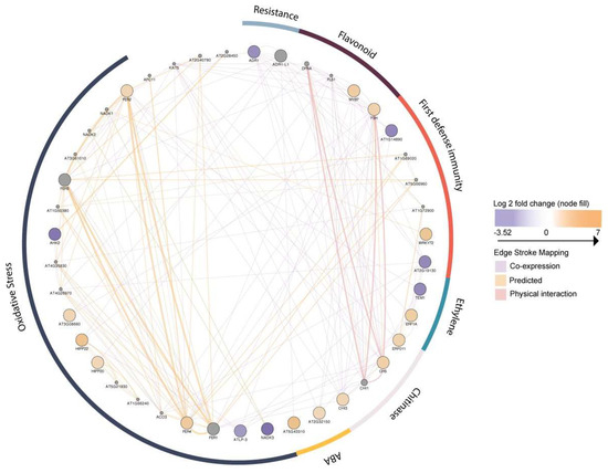 The networks of differentially expressed genes were constructed with the 272 Arabidopsis orthologs involved in constitutive metabolism (carbohydrate, amino acid, lipid metabolism, and signal transduction), chloroplast (energy metabolism), developmental (cell growth and death), membrane (Glycan biosynthesis and metabolism), stress (biosynthesis of secondary metabolites), and transport activities. The classification was based on KO annotation and function (Figures S4 and S5). Within the stress regulation group, the activities of several phytohormones were reconstructed to better represent the ethylene and flavonoid interactions, and the activities of chitinases (Figure 5).