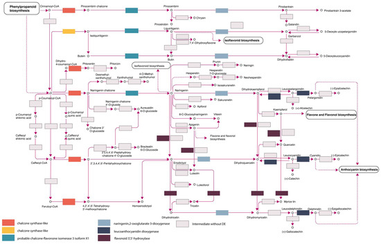 From the 980 GO terms represented in the DE transcripts, 226 entries were defined based on their KO term (KEGG Ontology). The most complete reconstructions were obtained from the biosynthesis of secondary metabolites such as flavonoid biosynthesis, intermediates that regulate the phenylpropanoid biosynthesis, flavone and flavonol biosynthesis, and anthocyanin regulation (Figure 6; KEGG ID:00941; [65]).