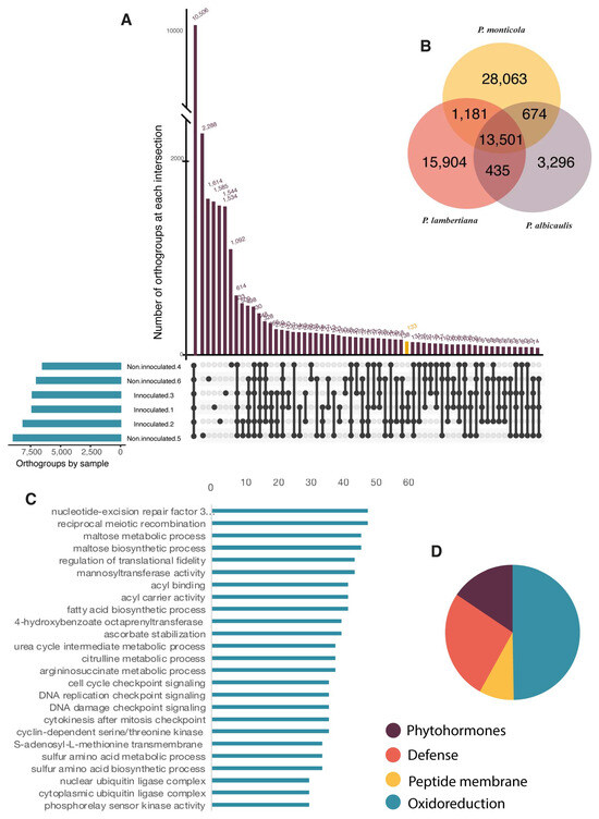 Gene family comparison. (A) Filtered gene families shared among six Pinus albicaulis transcriptomes identified by Orthofinder. (B) Venn diagram depicting the unique and shared gene families in the protein comparison among transcriptome assemblies for P. albicaulis (blue), P. monticola (yellow), and P. lambertiana (orange). (C) Abundance of the 25 most represented orthogroups on WPBR-infected transcriptomes across P. albicaulis, P. lambertiana, and P. monticola. (D) Gene abundance proportion for orthogroups shared across the three species activities related to oxidoreduction (blue; 378), peptide membrane constitution (yellow; 64), defense (orange; 200), and phytohormones (purple; 116).