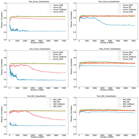 The approach of integrating feature selection with machine learning is equally applicable to the classification tasks of qualitative traits. As can be seen in Table 2 and Table S2, within the test dataset, the overall performance of the SVM model is excellent, and the SVM model utilizing F-SCORE shows the optimal performance, achieving an accuracy of 65.48%. The second good prediction performance is the SVM model utilizing MIC, which requires much fewer SNPs than under F-SCORE methods, but the accuracy is only 0.17% lower than F-SCORE, respectively. Furthermore, as depicted in Figure 3, aside from the KNN algorithm, which demonstrates a trend of performance decline with an increase in the number of features, indicating instability, the MIC feature selection method is capable of achieving comparable predictive performance to F-SCORE across different models with fewer features. This underscores the superior generalization ability and optimal overall classification performance of the MIC method in this classification task.