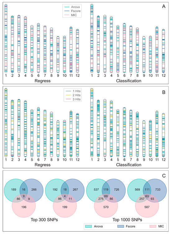 Differences between various feature selection methods: (A). Distribution of the top 300 SNPs selected by different feature selection methods on rice chromosomes (left is regression tasks, right is classification tasks). Green represents ANOVA, blue represents F-SCORE, and red represents MIC. (B). Intersection of results from different feature selection methods (left is regression tasks, right is classification tasks). Also using the top 300 SNPs, blue represents SNPs selected by only one method, yellow represents SNPs selected by two methods, and red represents SNPs selected by all three methods. (C). Venn diagrams of features selected by different methods. From left to right: regression tasks with the top 300 SNPs, classification tasks with the top 300 SNPs, regression tasks with the top 1000 SNPs, and classification tasks with the top 300 SNPs.