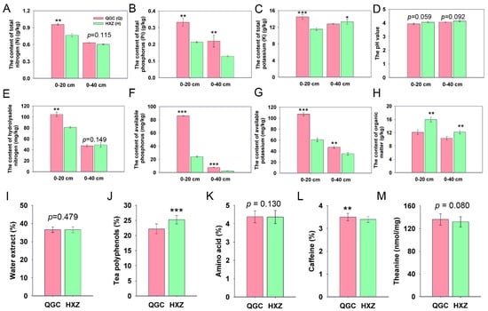 To effectively evaluate the influences of organic and chemical fertilizers on chemical characteristics in both tea orchards, the soil chemical properties derived from different depth (0–20 cm and 0–40 cm) were determined. Significant differences were observed in the tea orchards treated with either organic (HYZ) or chemical fertilizers (QGC). The results showed that the mineral elements of the soil are mainly enriched in the surface of the soil (0–20 cm) (Figure 1). In general, the contents of total nitrogen, total phosphorus, total potassium, hydrolysable nitrogen, available phosphorus, and available potassium were significantly higher in the chemical fertilizer treatment at a depth of 0–20 cm compared to the organic fertilizer treatment group (Figure 1A–C,E–G). However, the soil pH level was similar between the two tea orchards (p > 0.05), both in the surface and deeper in the soil (Figure 1D). As expected, an abundant accumulation of the organic matter was found in the organic treatment group (Figure 1H). However, the contents of total nitrogen and hydrolysable nitrogen were similar between the two treatment groups at a depth of 0–40 cm (p > 0.05) (Figure 1A,E).