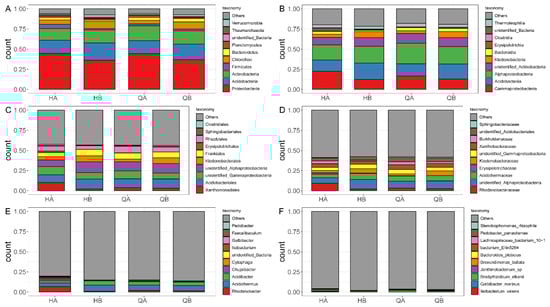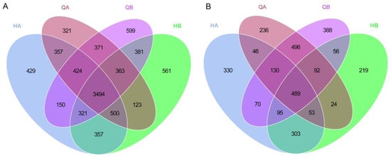 In order to investigate the soil microorganisms of each sample, effective tags were used to conduct operational taxonomic unit (OTU) clustering based on 97% consistency and species annotation. According to the clustering analyses, there were a total of 8451 bacterial OTUs from full-length 16S rRNA and 3027 fungal OTUs from ITS. Overall, 3494 bacterial OTUs (41.3%) were shared in all samples (Figure 1A) and 429 (5.1%), 321 (3.8%), 599 (7.1%), and 561 (6.6%) bacterial OTUs were detected in HA, QA, QB, and HB samples, respectively (Figure 2A). For fungal taxa, 330 (9.4%), 236 (6.8%), 388 (11.1%), and 219 (6.3%) OTUs were independently detected in HA, QA, QB, and HB samples, of which 489 OTUs (14.0%) were found in all samples (Figure 2B).