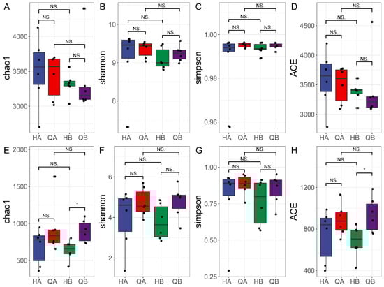 Alpha diversity of microbiomes in organic (HA and HB) and chemical fertilizer (QA1 and QB1) treatment soil. (A–D) The alpha diversity analysis indices of bacterial species; (E–H) the alpha diversity analysis indices of fungi species. The alpha diversity indices used in this study were chao1, Shannon, Simpson, and ACE. The datasets from six independent replicates for each sample were pooled. “*” shows statistically significant difference based on a t-test (p < 0.05); “NS.” means no statistical difference based on a t-test (p ≥ 0.05).