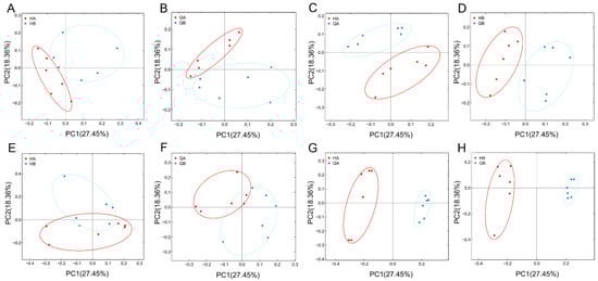 Based on the ANOSIM analysis, the inter-group differences were found to be higher than the intra-group ones (R-value > 0) between 16S rRNA and ITS rRNA, and the statistical analysis was significant (p-value < 0.05) except for QB-HB in the bacterial group and QB-QA in the fungal group (Table S3). To investigate the microbial community composition of different samples, principal coordinate analysis (PCoA) was employed to characterize differences in microbial composition between the treatment groups. The results showed that the PC1 and PC2 components of PCoA accounted for 27.45% and 18.36% of the total bacterial and fungal composition variations, respectively. The results showed that the microbial composition of different samples from the same treatment (HA and HB, QA and QB) revealed a slight difference among samples (Figure 4A,B,E,F), while the microbial composition of different samples from the different treatment (HA and QA, HB and QB) was significantly clustered into two separate groups (Figure 4C,D,G,H).