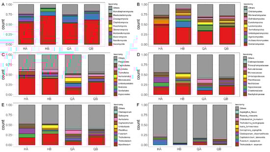 To further explore the fungal distribution pattern and abundance, the composition of the fungal community at different taxonomic levels according to the microorganisms with the top 10 abundances were summarized (Figure 6). The results indicated that Ascomycota and Basidiomycota served as the basic composition pattern at the phylum level (Figure 6A and Table S5). Compared to the QA and QB samples, a unique class, such as Tremellomycetes, had relatively higher abundance in the HA and HB samples (Figure 6B and Table S5). At the order level, Tremellales was also the dominant taxon in the HA and HB samples. On the contrary, specific orders, such as Microascales and Auriculariales, had significantly higher abundance in the QA and QB samples (Figure 6C and Table S5). We also found the predominant distribution in the HA and HB samples, such as Chaetomiaceae at the family level, Trichoderma at the genus level, and Fusarium oxysporum at the species level (Figure 5C–F and Table S5).
