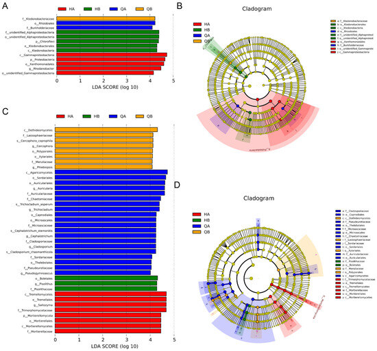 LEfSe analysis was also used to cover different levels of taxa change of fungi among different soil samples and find the biomarkers. The results showed that, in the HA group, Pisolithaceae, Tremellomycetes, Tremellales, Saitozyma, and Trimorphomycetaceae had a higher abundance with LDA scores over 4. In addition, more taxa had LDA scores above 4. In the HB and QB groups, three and eight biomarkers had LDA scores above 4, respectively (Figure 7C,D). At the phylum level, according to the MetaStat analysis, the results indicated that the abundance of Mucoromycota and Ascomycota was increased. Moreover, many fungi with higher relative abundance at the genus level were characterized in the HA group, such as Cephalotrichum, Trichocladium, and Pseudogymnoascus. On the contrary, these specific taxa, which were up-accumulated in the HA group, were significant decreased in the QA and HB groups (Figure S2).