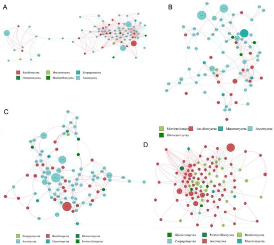 Based on calculation of the Spearman correlation coefficient, the microbial networks in four groups from HA, HB, QA, and QB were generated. The results showed that the core phyla of bacteria and fungi were Proteobacteria and Ascomycota, respectively (Figure 8 and Figure 9). In addition, we summarized the topological properties of the bacterial networks and found that the topological characteristics, including modularity (MD), network diameter (ND), clustering coefficient (CC), graph density (GD), average degree (AD), and average path length (APL), in the four groups did not significantly change, except for the fact that AD in HA is higher than that of other groups (Table S6). For fungi, CC, GD, and AD in the HA group had much higher values than those of other groups (Table S6). The results indicated that the network relationship of the fungal communities was probably influenced by the application of the organic fertilizer.