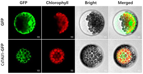 Based on the CDS sequence with the termination codon removed, primers that carry the cleavage sites of BamHI and EcorI were designed (Table S1). GFP green fluorescent vector was selected as the expression vector, a fusion expression vector 35S-CsTAU1-eGFP was constructed, Trans1-T1 was transformed into Escherichia coli and identified. The extraction and transformation of Arabidopsis protoplasts are detailed in Supplementary File S1. They were observed using a laser confocal microscope (TCS SP2 Leica, Berlin, Germany) [].