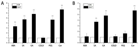 Expression analysis of CsTAU1 under different hormone and stress conditions. (A) Expression analysis of CsTAU1 in ‘D1909’. (B) Expression analysis of CsTAU1 in ‘D1604’. “**” presents p < 0.01; CK is distilled water treatment, SAT is salt–alkali treatment.