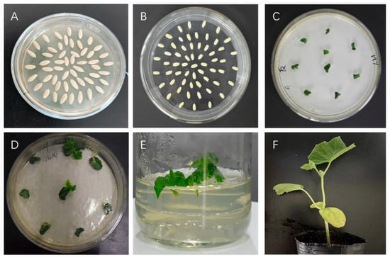 Using the cotyledon nodes of ‘D1909’ and ‘D1604’ as explants, the CsTAU1 was introduced into them through the Agrobacterium infection method. T0 generation transgenic cucumbers were obtained. After domestication, genetically modified seedlings were transplanted into greenhouses (Figure 6).