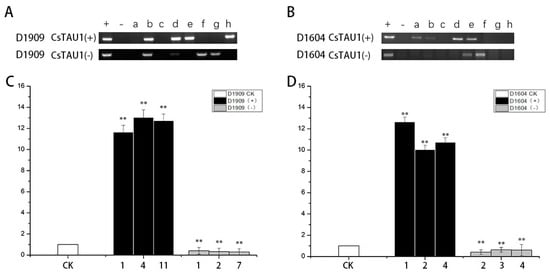 Molecular biological verification of overexpressing cucumbers. (A) PCR detection of ‘D1909’ CsTAU1 (+) and ‘D1909’ CsTAU1 (−)-overexpressing plants; (B) PCR detection of ‘D1604’ CsTAU1 (+)- and ‘D1909’ CsTAU1 (−)-overexpressing plants; a, b, c, d, e, f, g, h: PCR product. (C) qRT-PCR detection of ‘D1909’ CsTAU1 (+)- and ‘D1909’ CsTAU1 (−)-overexpressing plants; (D) qRT-PCR detection of ‘D1604’ CsTAU1 (+)- and ‘D1604’ CsTAU1 (−)-overexpressing plants. “**” presents p < 0.01.