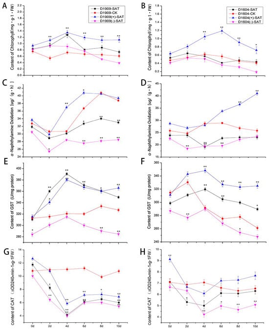 Physiological and biochemical indexes under salt−alkali treatment. (A) Chlorophyll content of ‘D1909’. (B) chlorophyll content of ‘D1604’. (C) α-Naphthylamine oxidation of ‘D1909’. (D) α-Naphthylamine oxidation of ‘D1604’. (E) GST content of ‘D1909’. (F) GST content of ‘D1604’. (G) CAT content of ‘D1909’. (H) CAT content of ‘D1604’. “*” presents p < 0.05; “**” presents p < 0.01.