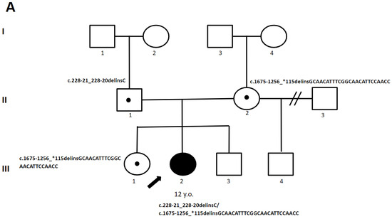 Bioinformatic pipeline: Sequence reads were aligned to the human reference genome hg19 using the Burrows–Wheeler Aligner (http://bio-bwa.sourceforge.net/ accessed on 10 Ferbuary 2024). Single-nucleotide variants and small insertions and deletions (indels) were called with the Strelka2 Small Variant Caller (https://github.com/Illumina/strelka accessed on 10 February 2024) and the Genome Analysis Toolkit v.4 (https://gatk.broadinstitute.org/ accessed on 10 February 2024). Structural variants were searched with Manta (https://github.com/Illumina/manta accessed on 10 February 2024) and Delly (https://github.com/dellytools/delly accessed on 10 February 2024). A manual search for discordant and split reads was performed using the IGV browser (https://www.igv.org/ accessed on 10 Februaru 2024). The reported variants were annotated with their genomic coordinates, allele frequency (gnomAD database, http://gnomad.broadinstitute.org/ accessed on 10 February 2024), functional consequence, and impact level on the gene product using SnpEff v5 (http://pcingola.github.io/SnpEff/ accessed on 10 February 2024). Variants were prioritized by the consensus score of the set of bioinformatic tools, which predict the pathogenicity of the variant and the deleterious effect on proteins (SIFT, SIFT4G, Polyphen2, MutationAssessor, FATHMM, PROVEAN, DEOGEN2, LRT, PrimateAI, MetaSVM, MetaLR, SpliceAI, MMsplice, SPiP, and Spidex). Data analysis was performed with an in-home NGS data–genome interface. All variants revealed by massive parallel sequencing were validated by Sanger sequencing in all patients and both of their parents. Variants were named according to the HGVS nomenclature and validated using VariantValidator (https://variantvalidator.org accessed on 10 February 2024).