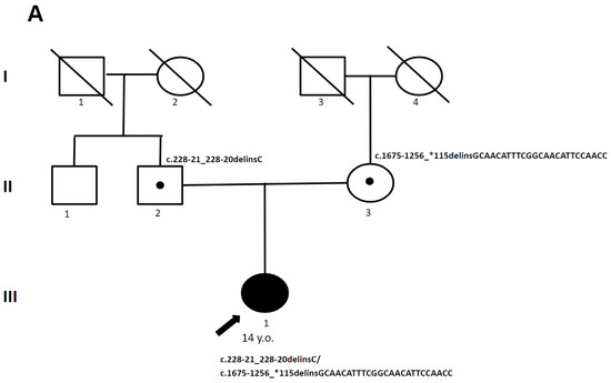 (A) Agarose gel detection of the novel indel variant. 1. PCR product for exon 17 and 3′ region detection—present in normal control and heterozygous carriers for the novel indel variant (forward primer of exon 17 and the reverse primer flanking the deletion—753 bp); 2. indel-specific PCR product—present only in samples with novel indel variant (flanking primers for the deleted region—516 bp); 3. PCR product for 17 exon detection—present in normal control and heterozygous carriers for the novel indel variant—386 bp. (B) PCR product 2 Sanger sequencing chromatogram with the novel indel variant.