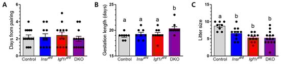 Female insulin receptor mice are subfertile. Control females and those lacking one or both insulin receptors were bred to males of established fertility. (A) All female mice presented with post-coitus vaginal plugs to indicate successful mating. Data shown are the mean delay for the appearance of the first plug (n = 10–15). (B) After mating, the pairs were separated, and the gestational length was measured from plug date to birth across all genotypes (n = 8–9). (C). The number of pups produced per litter from successful pregnancies (n = 7–16). (A–C). Bar heights indicate the mean ± SEM for each genotype. Letters denote means that are significantly different (p < 0.05), one-way ANOVA with a Tukey multiple comparison post-test.
