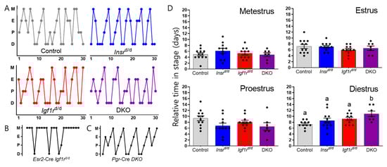 Estrous cycles were monitored for 30 days (n = 7–12). (A) Representative plots for each genotype are shown indicating the transition from metestrus (M) to estrus (E) to proestrus (P) and to diestrus (D). (B) For comparison, the ablation of Igf1r using Esr2-Cre is shown, which acts earlier than Amhr2-Cre in granulosa cells of activated follicles and in the developing ovary, has ovulation failure. (C) For comparison, the ablation of both Insr and Igf1r using Pgr-Cre is shown, which acts later than Amhr2-Cre in granulosa cells of activated follicles and in the developing ovary, has partial ovulation impairment. (D) The number of days at each stage of the estrous cycle were plotted for each animal. Bar heights indicate the mean ± SEM for each genotype. Letters denote means that are significantly different (p < 0.05), one-way ANOVA with a Tukey multiple comparison post-test.