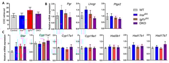 To determine whether the normal estrous cycles we observed indeed correlated to successful ovulation, we superovulated female mice, excised their oviducts, and flushed cumulus–oocyte complexes (COCs) for morphological assessment and quantification. All three conditional knockout lines produced COCs that had intact granulosa cell layers and were indistinguishable from control COCs. There were no significant differences in the number of COCs retrieved from any group (Figure 4A). We never observed oocytes trapped in corpora lutea in Amhr2-Cre DKO ovaries, in contrast to the Pgr-Cre DKO mice in which they were found frequently [17]. Indeed, the number of COCs retrieved matched very closely with the number of CL present on the ovarian surface with COC/CL ratios of 91 ± 1.5% in control animals and 87 ± 3.2% in DKO mice (n = 5). In addition to the absence of trapped oocytes, luteinization appeared more uniform within CL cross-sections as assessed by immunohistochemistry for the luteal cell marker HSD17B7 (Supplemental Figure S1B). In Pgr-Cre DKO mice, HSD17B7 staining was sporadic indicating an altered timing of luteinization, and those mice exhibited a reduction in progesterone production and the downregulation of ovulation-promoting factors and several enzymes in the progesterone synthesis pathway [17]. We similarly assessed the ovarian expression of Pgr, Lhcgr, and Ptgs2 at 12 h post-hCG in hyperstimulated mice and found no significant difference between control, single receptor, and DKO mice (Figure 4B). A modest but statistically insignificant increase in Star expression was observed in Igf1rd/d and DKO mice (Figure 4C). However, all six genes examined in the subsequent steroid hormone synthesis pathway were unaltered in any knockout mice line.