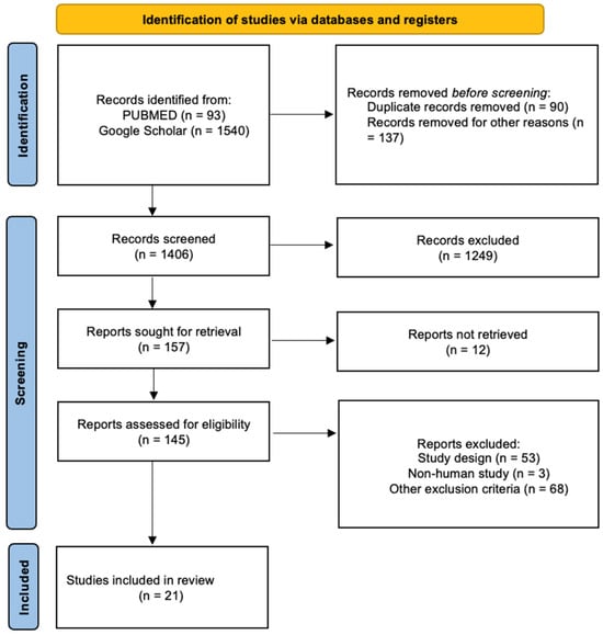 The present systematic review was carried out according to the Preferred Reporting Item for Systematic Review (PRISMA) standards. A methodological appraisal of each study was conducted according to the PRISMA standards, including an evaluation of bias. The PRISMA 2020 Statement was applied. It consists of a checklist and a flow diagram (Figure 1).