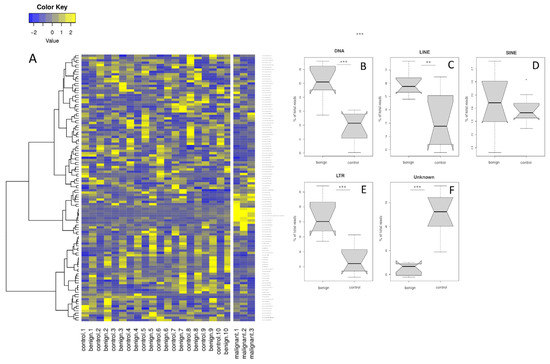 (A) Heatmap of differentially expressed TEs in control and adjacent benign lesions of 10 fish and malignant samples (n = 3) from the same sequencing run. Equal numbers for control and benign samples indicate identical individuals. Transcripts with higher expression levels are shown in yellow, while lower expression is shown in blue. Right panels: Boxplots of differential expression of control (skin) and benign lesions according to transposon family type: DNA (B), LINE (C), SINE (D), LTR (E) transposons, and uncharacterized TEs (F). Student’s t-test: * p < 0.05, ** p< 0.01, *** p < 0.001.