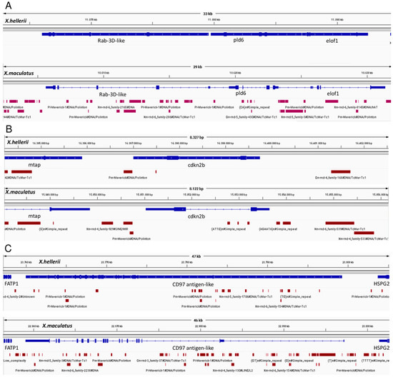Integrative Genomics Viewer (IGV): region around the three candidate genes rab3d-like (A), cdkn2a/b (B), and CD97 antigen-like (C). In the upper panel RepeatMasker-annotated TEs in X. hellerii are shown as red bars. In the lower panel panel, RepeatMasker-annotated TEs in X. maculatus are shown.