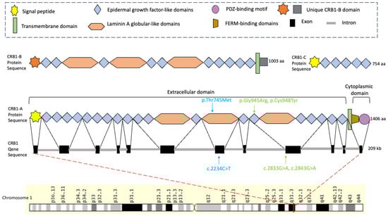 The Crumbs protein is a large transmembrane protein originally discovered at the apical membrane of Drosophila epithelial cells [1]. It was later found that mutations in Crumbs homolog-1 (CRB1), a human homolog of the Drosophila protein Crumbs, caused retinal dystrophies in humans [2]. The human CRB1 gene (Cytogenetic location: 1q31.3, OMIM #604210, 209 kb) comprises 12 alternatively spliced exons resulting in three different isoforms of CRB1: CRB1-A, CRB1-B, and CRB1-C. The CRB1-A isoform (1406 aa) contains extracellular domains (nineteen epidermal growth factor-like domains, three laminin A globular-like domains, and a signal peptide), a transmembrane domain, and small cytoplasmic domains (FERM-binding domains and a PDZ-binding motif). The CRB1-B isoform (1003 aa) possesses a transmembrane domain, a large part of the extracellular domain, and a unique C- and N-terminus (Figure 1) [3,4]. The CRB1-C isoform (754 aa) contains the initial epidermal growth factor-like domains of CRB1-A (Figure 1). In the murine retina, CRB1 isoforms represent cell-type-specific expression patterns; CRB1-B localizes exclusively to photoreceptors, while CRB1-A is found in Müller glial cells [5]. There is no evidence of cell-type-specific expression patterns for the CRB1-C isoform in the literature.