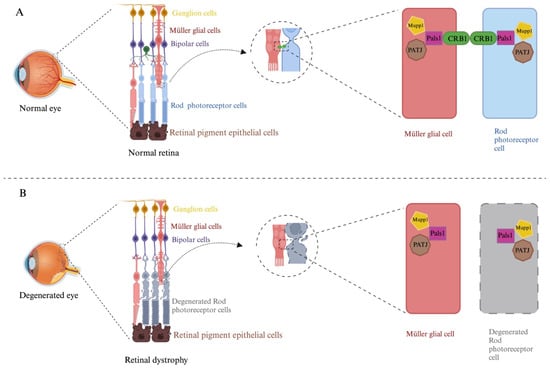 Figure 2. Model of CRB1 localization in human retinal cells. (A) The general structure of the retina comprises several cell types: Müller glial cells, bipolar cells, horizontal cells, amacrine cells, retinal ganglion cells, rods, and cones. CRB1 is localized at the subapical region above the adherens junction between the photoreceptor and Müller glial cells as part of protein complexes formed by Lin seven 1 (Pals1), Pals1-associated TJ protein (Patj) and multiple-PDZ domain protein 1 (Mupp1). The CRB1 protein complex plays a crucial role in photoreceptor morphogenesis, apicobasal polarization and adherent junctions in retinal cells. (B) A loss of the CRB1 protein leads to retinal dystrophy due to photoreceptor and Müller glial cell degeneration. The figure was created using BioRender (www.biorender.com, last accessed on 7 January 2024).