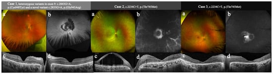 • Clinical assessment and retinal imaging: A complete ophthalmic examination and imaging were performed on each of the three patients. Details of the clinical assessments, including visual acuity and dilated fundal examinations, were collected. The patients underwent retinal imaging, including color and wide-field photography, fundus autofluorescence (55° and 30°), optical coherence tomography (Spectralis HRA2, Heidelberg Engineering, Heidelberg, Germany), and wide-field fundus imaging (Optos, 200Tx confocal scanning laser ophthalmoscopy camera).