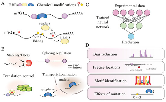 Modifications to RNA play pivotal roles in regulating gene expression, influencing a wide range of processes such as cellular differentiation, development, stress response and disease pathogenesis [1,2]. The term “epitranscriptomics” refers to the study of a broad range of modifications that influence RNA either co- or post-transcriptionally. Notable examples of modifications that play vital roles in regulating the fate of RNAs of protein-coding genes include RNA-binding proteins (RBPs) and a host of chemical modifications such as N6-methyladenosine (mA), m5-cytosine (mA), pseudouridine (), and adenosine-to-inosine (A-to-I) RNA editing (Figure 1A). These modifications exhibit diverse cellular functions, including mRNA stability or degradation, splicing regulation, translation, and transport and localisation of mRNA targets (Figure 1B) [3,4]. In humans, it is estimated that there are over 1500 RBPs, which divide into a number of sub-families and possess a range of RNA-binding domains, including the RNA recognition motif (RRM), K-homology domain (KH), double-stranded RNA-binding domain (dsRBD), and zinc-finger domains. Furthermore, RBPs tend to localise to specific sub-cellular compartments, exhibit context-specific binding patterns, and often have highly specific sequence preferences [5]. The most well-studied chemical modification, mA, is typically found in the 3 untranslated region (3 UTR) and around the stop codon of modified transcripts [6], and its functions are mediated by a specific set of RBPs known as mA readers [7]. In contrast to mA, which is reversible, A-to-I RNA editing is an irreversible modification catalysed by the enzymatic activities of the RBP protein family Adenosine deaminases acting on RNA (ADAR), which act on double-stranded RNA (dsRNA) and play particularly important roles in self or non-self recognition in the regulation of immune response [8]. Whilst individual RNA modifications have profound consequences on RNA function, they do not behave independently, and how they coordinate to exert their regulatory effects is highly complex and has significant implications for understanding gene regulatory control. Before this complexity can be fully deciphered, however, a crucial prerequisite is to determine which transcripts and precise positions are targeted by each modification and in what contexts, together with their sequence or structural preferences for binding.
