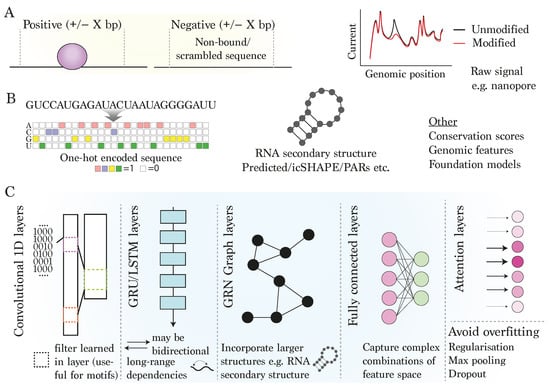 In order to decipher the complex regulatory roles of modifications to RNA, including their potential roles in disease, it is essential to be able to accurately pinpoint where and in which contexts these modifications occur. In recent years, numerous deep learning approaches have been published to this end, with some key examples summarised in Table 1. Whilst these approaches can vary greatly, Figure 2 outlines the most typical inputs, features and modelling strategies. First, ’positive’ regions (e.g., known binding locations with some surrounding context) are usually selected for training (Figure 2A). Since deep learning models have a reputation for requiring substantial numbers of training examples, many studies focus on data from large-scale efforts like ENCODE [13,14], or from other well-documented studies in human cell-lines [35,36], often aided by databases such as POSTAR3 [37] or m6A-Atlas [38,39]. Note that many deep learning models depend on proper processing of raw reads as a prerequisite. Rigorous pipelines exist for performing the necessary quality controls, conducting peak-calling and filtering regions also present in paired input samples, thereby generating a list of quality regions, or single-nucleotide positions in the case of some assays such as iCLIP [12], for use in further model training [40,41]. It is important to note, however, that even after peak-calling, certain biases, such as preferences towards certain sequence contexts, may still be present.