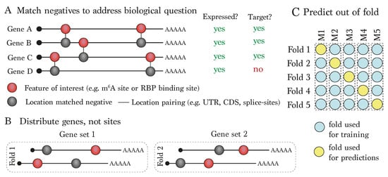 Figure 3 illustrates some suggestions for designing and training deep learning models to maximise biological insight. First, as mentioned, careful selection of negative site location is essential (Figure 3A). In addition, RBPs are not uniformly distributed across transcripts, but are often localised to highly specific regions, such as near splice sites or in the 3 UTR [14], and mA tends to be enriched near the stop codon. Since sequence and/or secondary structure preferences are highly variable across transcripts, general sequence patterns relevant to the transcript region or the presence of these specific features might be over-represented in intervals around the positive sites. Similar to the above situation with experimental biases, this could result in the model appearing to perform well, but in a way that is capturing region preferences independent of what is relevant to the binding of the specific modification. To circumvent this, when constructing machine learning models, it is suggested to consider carefully matching background sites according to transcript features, and preferably on genes that display similar expression distributions and/or are targets for the RBP of interest [77].