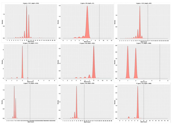 Examples of partial SSR loci typing in some offspring. Note: The horizontal coordinates represent the number of motifs, the vertical coordinates represent density, and the black vertical line in the middle represents the number of motifs in the reference sequence.