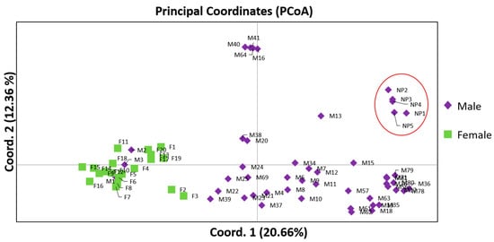 Principal Coordinate Analysis (PCoA) of 49 male and 20 female P. lentiscus var. chia individuals based on 169 polymorphic ISSR, RAPD and SCAR loci. The first two coordinates accounted for 33.03% of the total variance (axis 1 = 20.66%; axis 2 = 12.36%). The PCoA analysis demonstrate the separation of the two sex types (male vs. female) as distinct groups and differentiates the non-productive males in a sub-cluster. The red circle depicts the cluster of non-productive (NP) males.