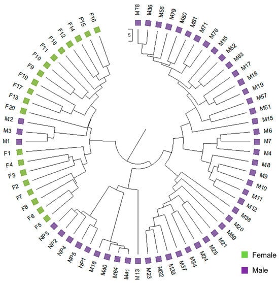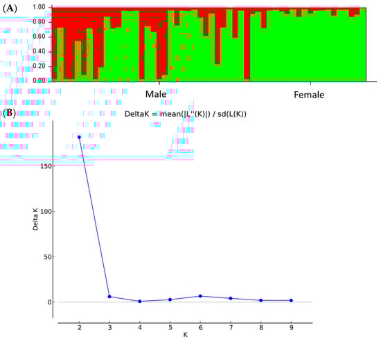 The genetic diversity of the total sample was high (P = 97%, I = 0.523 ± 0.033, Nei’s genetic distance = 0.153). Overall, 16 loci showed 96.88% polymorphism rate with a mean diversity (h) for all loci of 0.352 ± 0.026 and Shannon’s Index (I) 0.523 ± 0.033. There was one private allele found only in male population (Table 8). Results showed that the genetic diversity of male individuals was similar to that of the female population. The AMOVA showed highly significant (ΦST = 0.175, p < 0.001) genetic differences between male and female populations, with 18% of the total genetic diversity being attributed to differences among populations (Table 9). Structure analysis identified the maximum Delta K value being at K = 2 [Lnprob (K) = −802.1; Ln’(K) = 147.267; Ln’’(K) = 137.7; and Delta K = 1377) (Figure 6A,B), which was supported by the PCoA and UPGMA analysis (Figure 7). Interestingly, low levels of admixture were observed in the female population, whilst male populations demonstrated higher levels of admixture (Figure 6A).