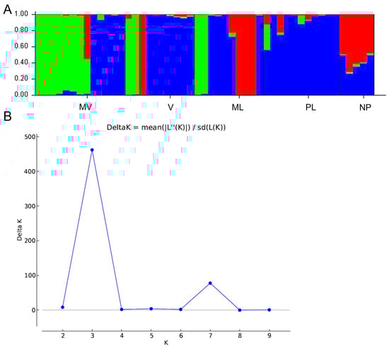 Genetic structure by Bayesian inference of 49 male individuals of P. lentiscus var. chia assigned to the following 5 cultivars: Mavroschinos (MV), Votomos (V), Maroulitis (ML), Platiphyllos (PL) and non-productive males (NP). (A) Bar plot based on estimated membership coefficient values (Q) for maximum K value (Delta K = 3). Each bar represents a different individual and different colors represent the estimated membership coefficients. (B) Delta K (mean). Estimation of the number of clusters for K ranging from 1 to 10 by calculating delta K values.