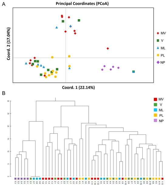 Genetic relationships of the 49 male individuals of five P. lentiscus var. chia cultivars, namely Mavroschinos (MV), Votomos (V), Maroulitis (ML), Platiphyllos (PL) and the non-productive males (NP) based on 134 polymorphic ISSR loci. (A) Principal Coordinate Analysis (PCoA). The first two coordinates accounted for 33.03% of the total variance (axis 1 = 22.14%; axis 2 = 17.04%). (B) The unweighted pairgroup method using arithmetic average (UPGMA) dendrogram based on the genetic distance matrix.