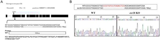 Genomic structure and targeted genetic modification of esr2b in zebrafish. (A) Gene structure of esr2b. Zebrafish esr2b contains 10 exons, with the translation initiation codon located on the second exon. Deletion of 16 nucleotides results in translation frameshift and early termination. * represent translation termination. Theoretically, the esr2b mRNA of knockout zebrafish only coding 60 amino acids. (B) Verified sequence change in esr2b knockout zebrafish.